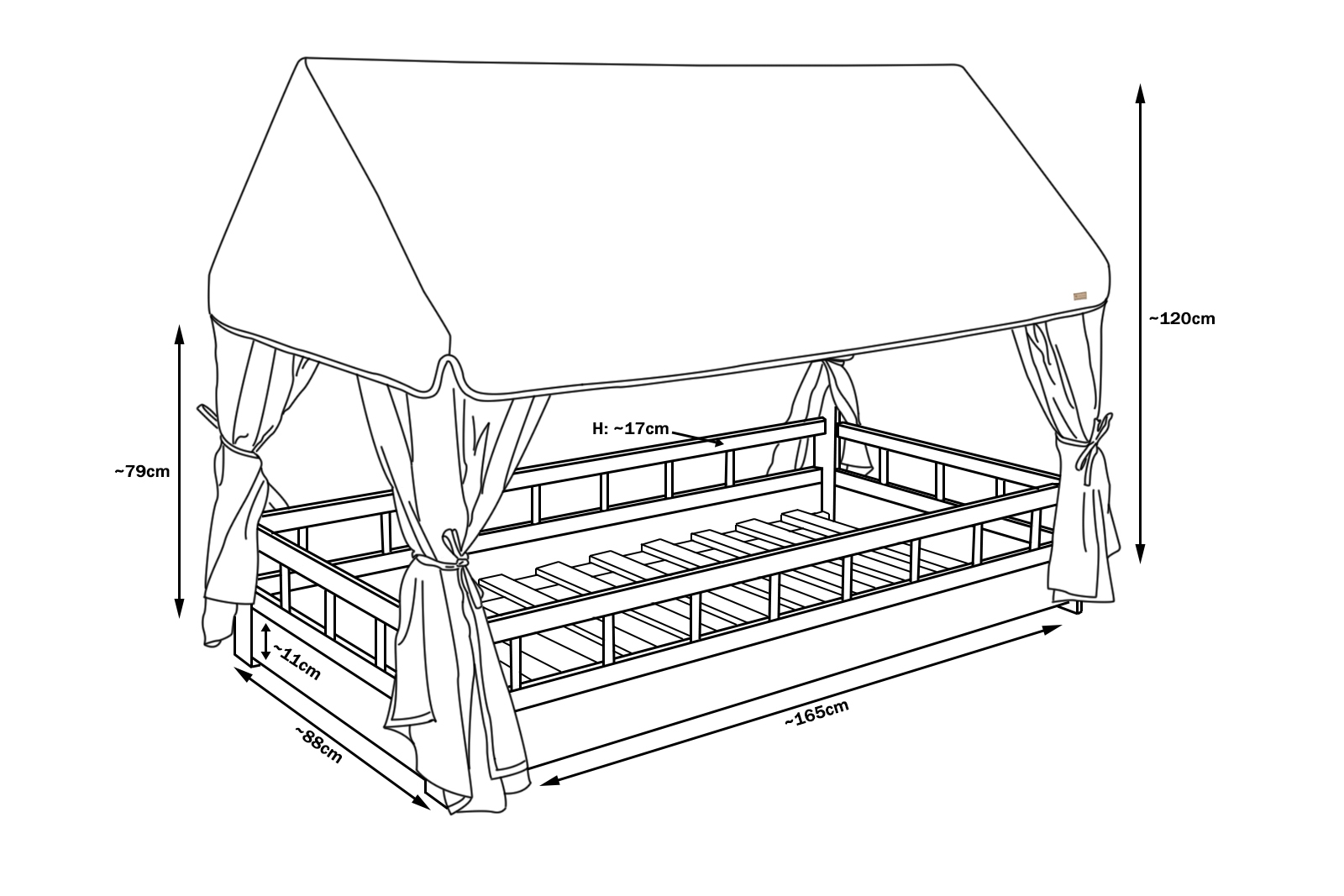 Sengen med stofbetræk og gardinerne, 160x80cm