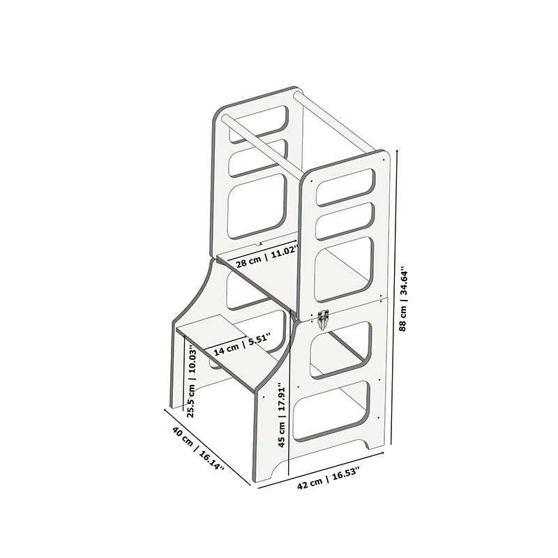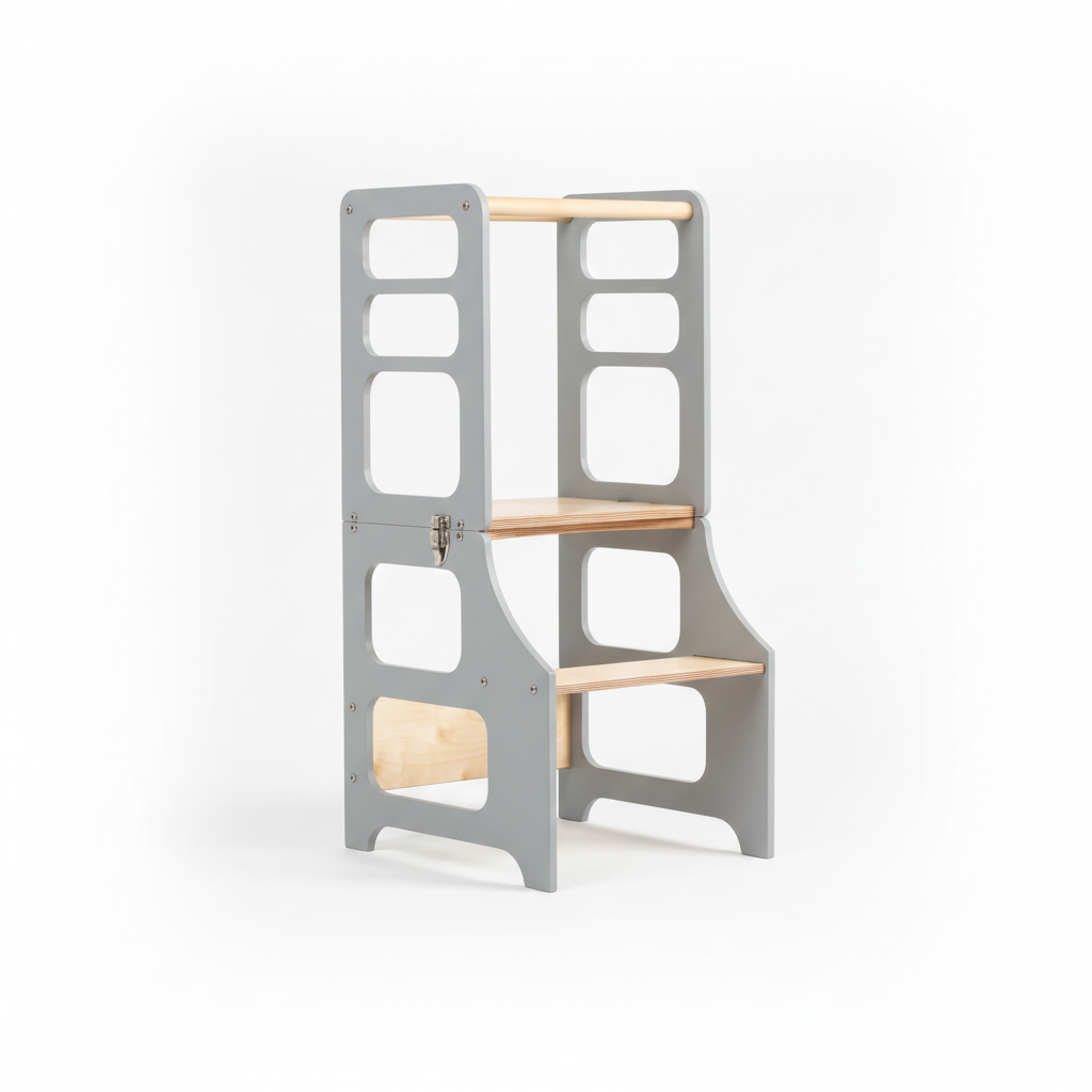 Materialer, dimensioner og samling: Læringstårnet er fremstillet af robust og slidstærk krydsfiner og leveres med to træstænger. Produktet sendes som selvmontering, men installationen er enkel og intuitiv. Detaljerede instruktioner medfølger, så du nemt kan opbygge dette funktionelle og sikre redskab til dit barn i køkkenet.