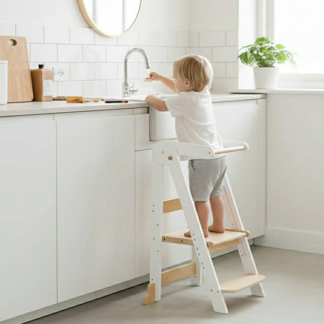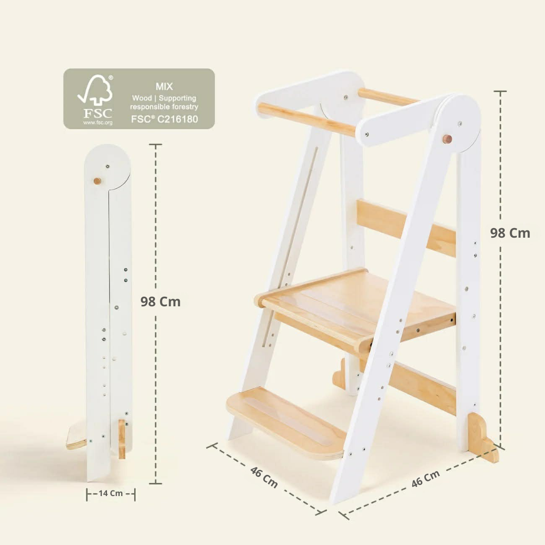 Dette Læringstårn har dog en funktion, som ikke kan ignoreres. Den er foldbar ! Hvad mere er - sammenfoldet er det den mindste Læringstårn på markedet - Som i nemt kan opbevare den, f.eks. bag et klædeskab.