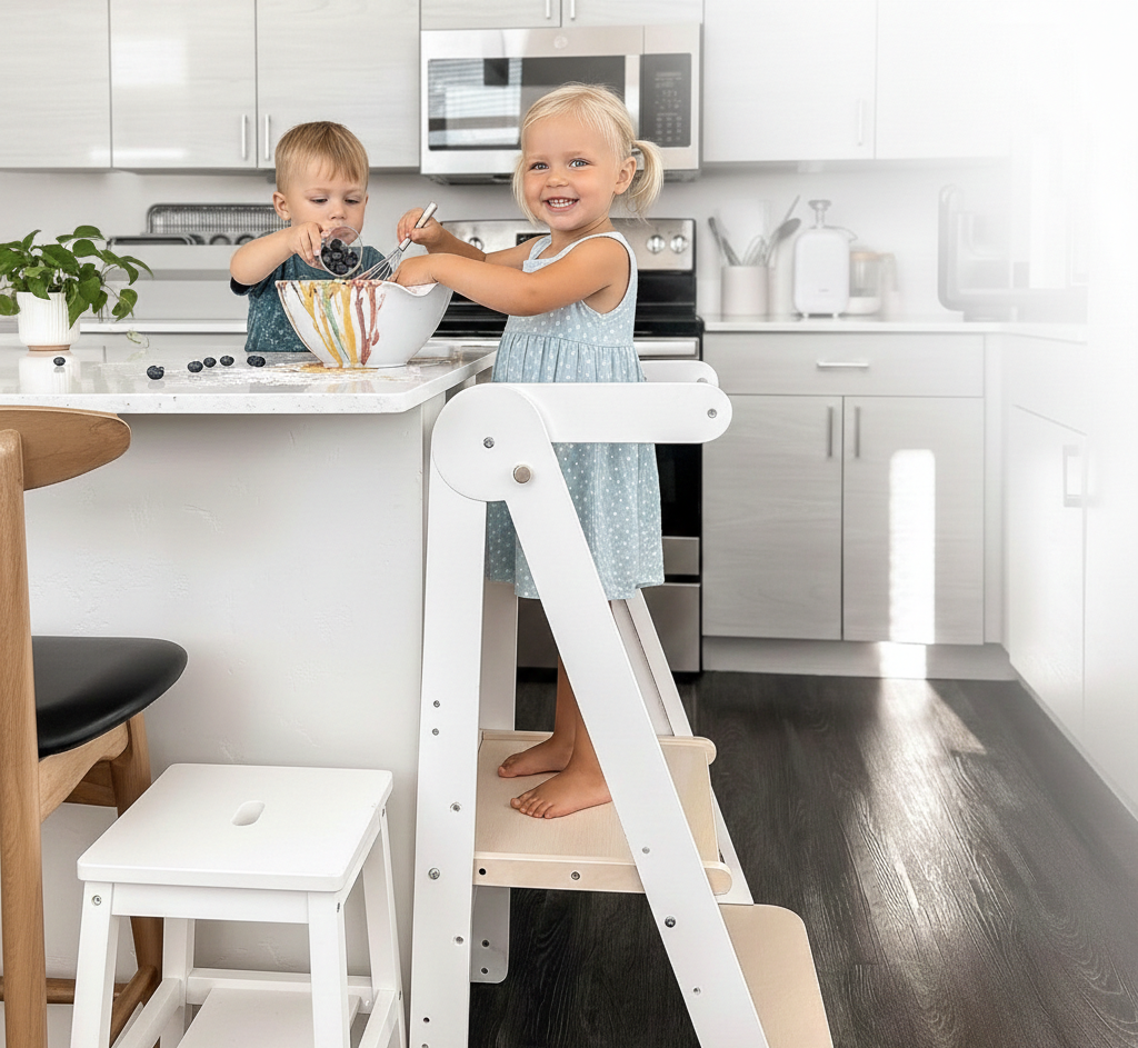 Vi fortsætter med at gøre det til en prioritet at holde børn sikre, mens de leger. Den foldbare køkkenhjælper har afrundede kanter og ekstra lukninger, der forhindrer køkkenhjælperen i at folde sig selv.