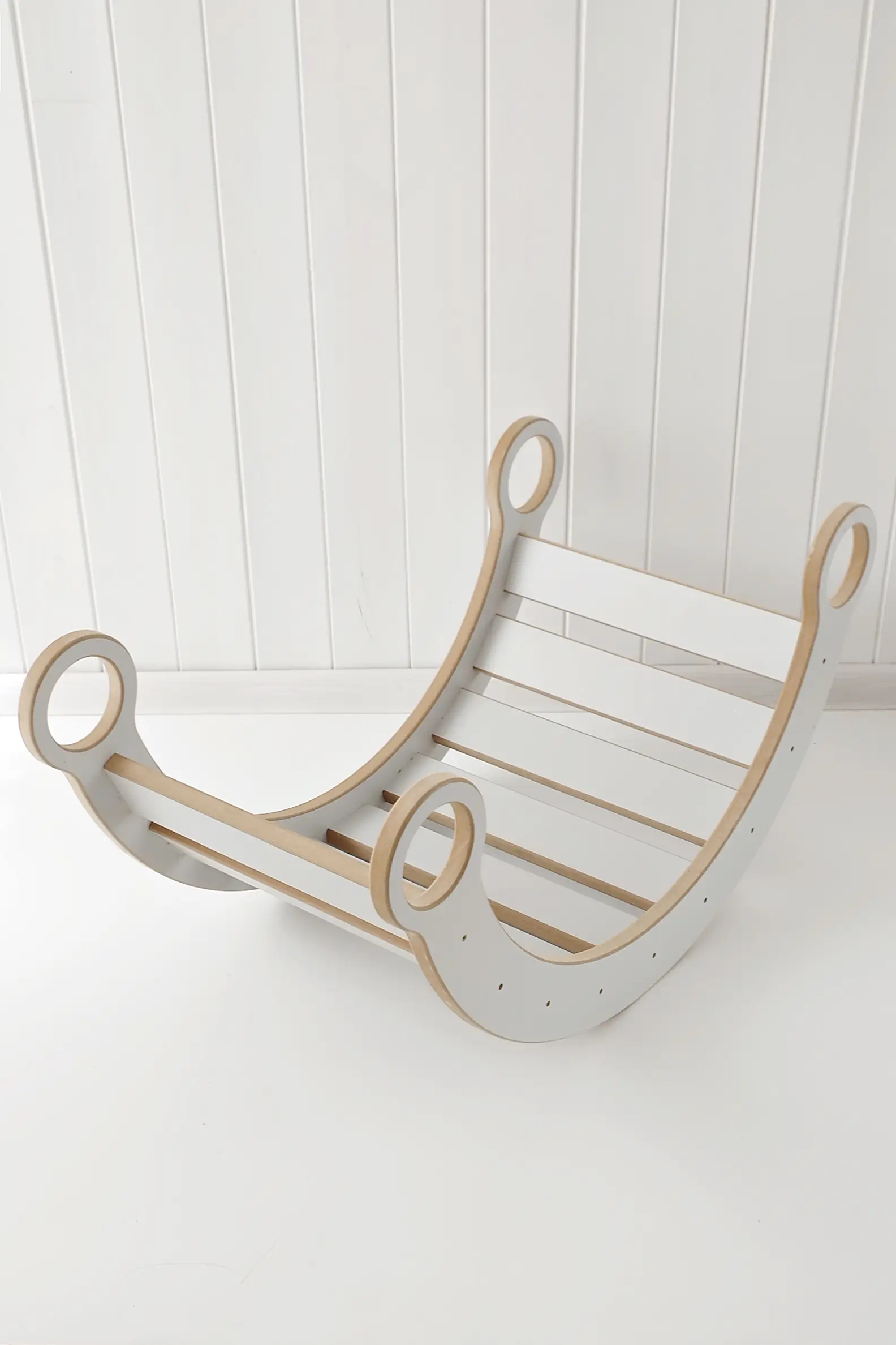 Vi bruger certificerede materialer af højeste kvalitet til at producere trævippen. I dette tilfælde er det krydsfiner med en imponerende tykkelse på 15 mm eller lamineret MDF , som gør børnerockeren ekstremt holdbar og stabil. Vi lægger også stor vægt på de små brugeres sikkerhed! Vippens fremspringende kanter er specielt afrundede, så det lille barn ikke kommer til skade under leg. Praktiske håndtag hjælper dit barn med at sætte Montessori-vippen i bevægelse eller stoppe den når som helst.